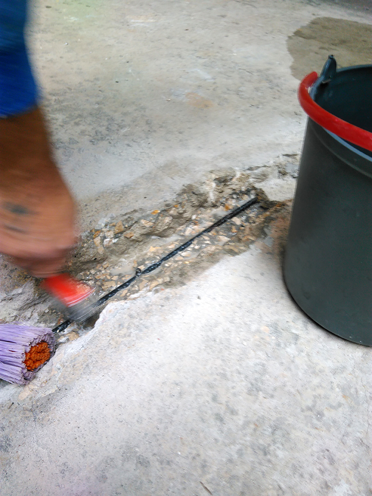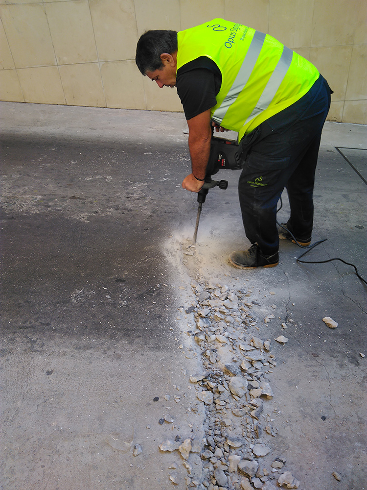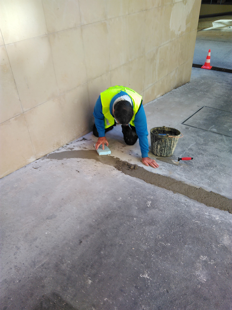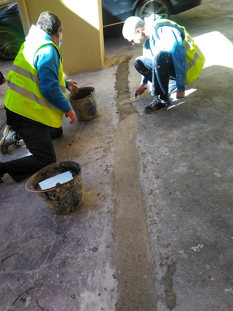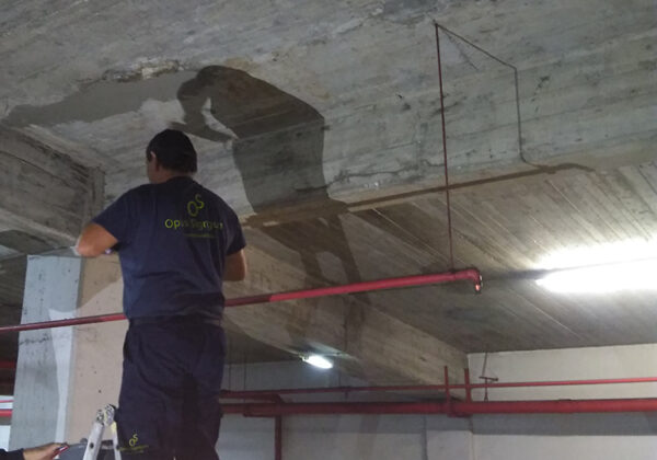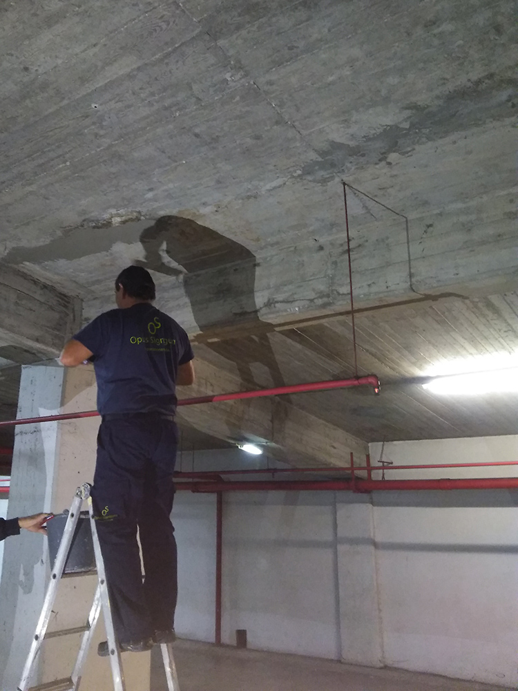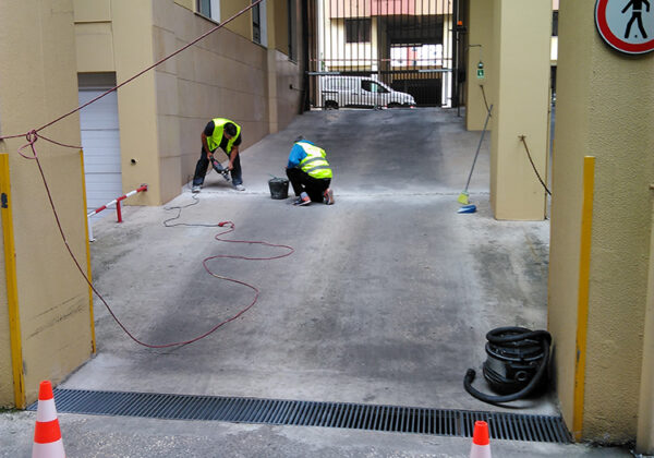 Reparação / Colmatação das Infiltrações: Protecção e isolamento de superfícies e equipamento com mantas de tecido e películas de plástico; Lavagem de superfícies a intervencionar com jacto de água a alta pressão e adjuvante líquido desengordurante; Alegrar as fissuras mecanicamente de forma a permitir a aplicação de agentes químicos; Fornecimento e aplicação de Spend/Labo na referida abertura; Fornecimento e aplicação de Durfix/Labo, na referida junta; Remoção de peliculas de plástico e mantas de tecido de protecção de superfícies e equipamentos e seu transporte para vazadouro autorizado.